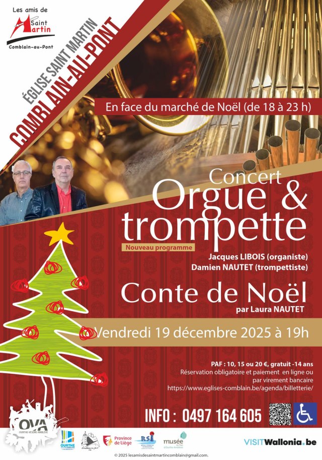 Pour ce concert de Noël 2025, l’organiste Jacques LIBOIS et le trompettiste Damien NAUTET se produiront avec la conteuse Laura NAUTET, dans l’église de Comblain-au-Pont, place Leblanc, le vendredi 19 décembre à 19h00, en même temps que le marché de Noël de Comblain-au-Pont (18h00 à 23h00).